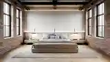 Exposed brick walls and herringbone wood flooring. Soft LED lighting above the bed contrasts with raw concrete ceilings. Minimalist furniture, neutral textiles, and a woven rug create an atmosphere of refined luxury.