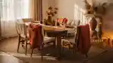 Sunlight highlights the rich grain of oak, chunky knit throws in burnt orange hues, and a woven jute rug. The ambiance is refined yet cozy – like an evening at a storied home.