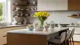 Mid-century kitchen with oak wood, marble countertops and glass jars. Bathed in natural light, exudes refined elegance.