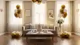 An elegant modern classic living room where gold balloons and confetti create a festive atmosphere. Beige walls, herringbone parquet flooring, and marble coffee table highlight luxury.