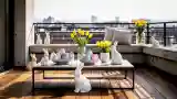 High-end terrace with exposed concrete walls, warm wooden flooring and minimalist metal table. Soft natural light enhances pastel Easter decor.