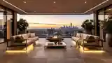 Minimalist terrace featuring sofas on metal frames and marble flooring. Warm LED lighting enhances the cozy ambiance overlooking the city.