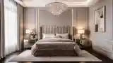 Luksusowy pokój w tonacji beżu i złota, z tapetą teksturalną, welurami i lśniącymi meblami. Złoty kryształowy żyrandol dominuje nad łóżkiem, podkreślając elegancję.