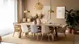 Jadalnia z drewnianym stołem i krzesłami z plecionki, oświetlona złotymi lampami wiszącymi. Naturalne tkaniny, rośliny doniczkowe oraz dywan z juty tworzą ciepłą, luksusową atmosferę.