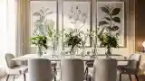 Jadalnia z marmurowym stołem i szarą tapicerowaną sofą, oświetlona naturalnym światłem. Wzory botaniczne na ścianach dodają elegancji.