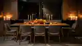 Wnętrze z drewnem, szarą tkaniną i ciepłym oświetleniem świec. Atmosfera luksusowa dzięki naturalnym materiałom i subtelnej dekoracji.