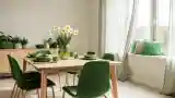 Stolik drewniany z tapicerowanymi krzesłami w kolorze zieleni, oświetlony naturalnym światłem. Wizualna harmonia drewna i tkaniny tworzy elegancką przestrzeń.