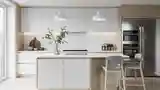 Kuchnia w stylu skandynawskim z naturalnym drewnem, białymi frontami i delikatną podświetlaniem. Świetliste wnętrze podkreśla tekstury marmuru, metalu oraz miękkich tkanin.