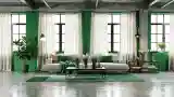 Salon z betonowymi sufitami, zielonymi ścianami i szarą sofą. Oświetlenie industrialne podkreśla tekstury marmuru i metalu.