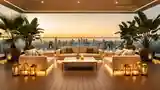 Elegancki salon z drewnianą podłogą, beżowymi sofami i marmurowym stolikiem. Oświetlenie LED i świecące latarnie tworzą ciepłą atmosferę nad miastem.