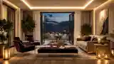 Luksusowa przestrzeń z purpurowymi welurami, złotymi ramami i ciepłym oświetleniem LED. Drewno podłogowe, klasyczne meble oraz rośliny w donicach tworzą elegancką atmosferę.