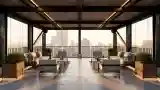 Szkło, beton i drewno tworzą elegancką przestrzeń. Ciepłe oświetlenie podkreślają matowe tekstury mebli.