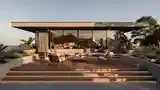Taras w stylu mid-century modern odbija złote promienie zachodzącego słońca. Drewniana podłoga, gładkie powierzchnie szkła oraz miękkie tkaniny tworzą luksusową atmosferę relaksu.