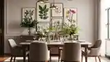 Elegancki stół z marmuru i drewna otoczony wygodnymi fotelami w beżowym tkaninie. Ściany zdobią botaniczne obrazy, a złote lampy nadają wnętrzu ciepłego blasku.