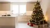 Kuchnia w stylu japandi połączyła minimalistyczne drewno jasnego odcienia, białe powierzchnie i ciepłe światło. Zimowy świetle od choinki podkreśla elegancję naturalnych tekstur.