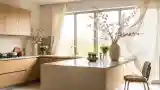 Minimalistyczne szafki z drewna jasnego odcienia, blaty marmurowe w tonacji beżu, delikatna biała tkanina okien. Naturalne światło podkreśla tekstury materiałów i spokojną atmosferę.