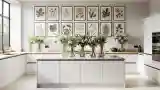 Kuchnia w stylu minimalistycznym, gdzie białe szafki spotykają się z naturalnym drewnem blatu i marmurkiem. Oświetlenie naturalne podkreśla tekstury materiałów – gładkie powierzchnie kontrastują z delikatną fakturą drewna.