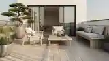 Elegancka terasa w stylu japandi, gdzie naturalne drewno spotyka się z delikatnymi tkaninami. Oświetlenie dnia podkreśla ciepłe odcienie drewna i chłodną biel ścian.