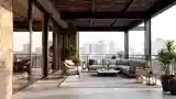 Balkon w stylu loftowym, gdzie ceglana ściana i sufit tworzą elegancką przestrzeń. Oświetlenie naturalne podkreśla tekstury betonu, metalowych ram oraz miękkich mebli z tkaninami beżowo-szarymi.