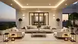 Sofy w jasnej tkaninie, drewniany stolik i świeczniki na kamiennym podłogowym wykładzinie. Oświetlenie LED nadaje wnętrzu luksusowy, ciepły klimat.