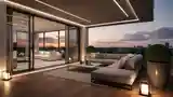 Luksusowa tarasa z drewnianą podłogą, miękkimi sofami i ciepłą oświetleniem LED. Wysokie szklane drzwi łączą wnętrze z otwartym przestrzenią nad widokiem na miasto.